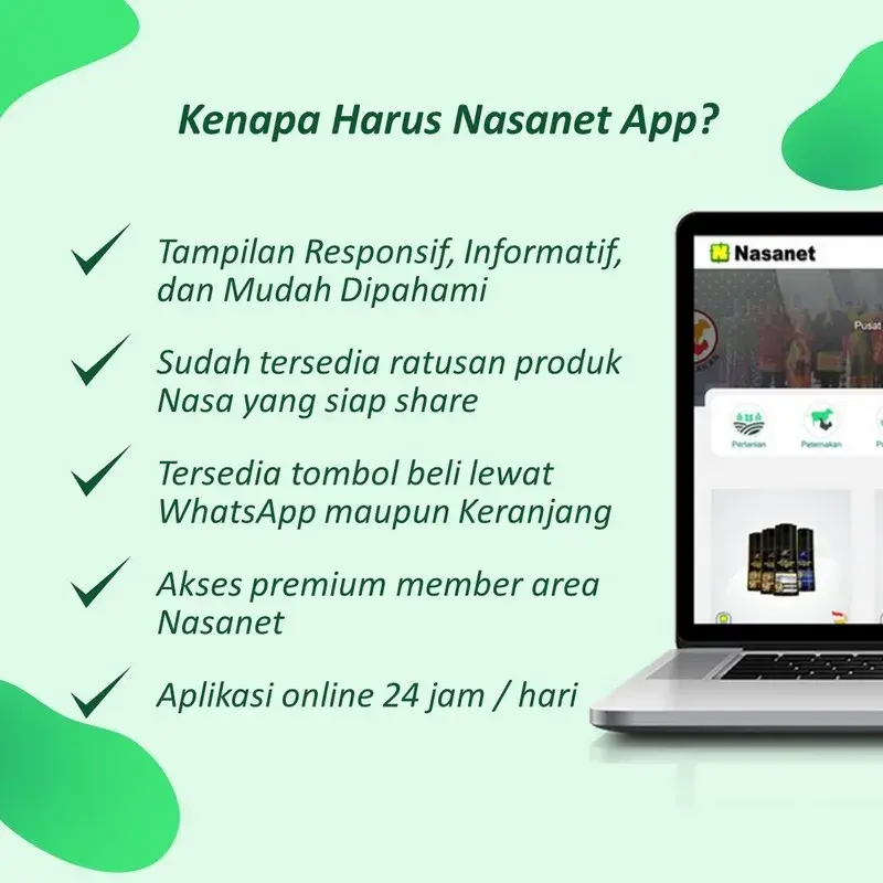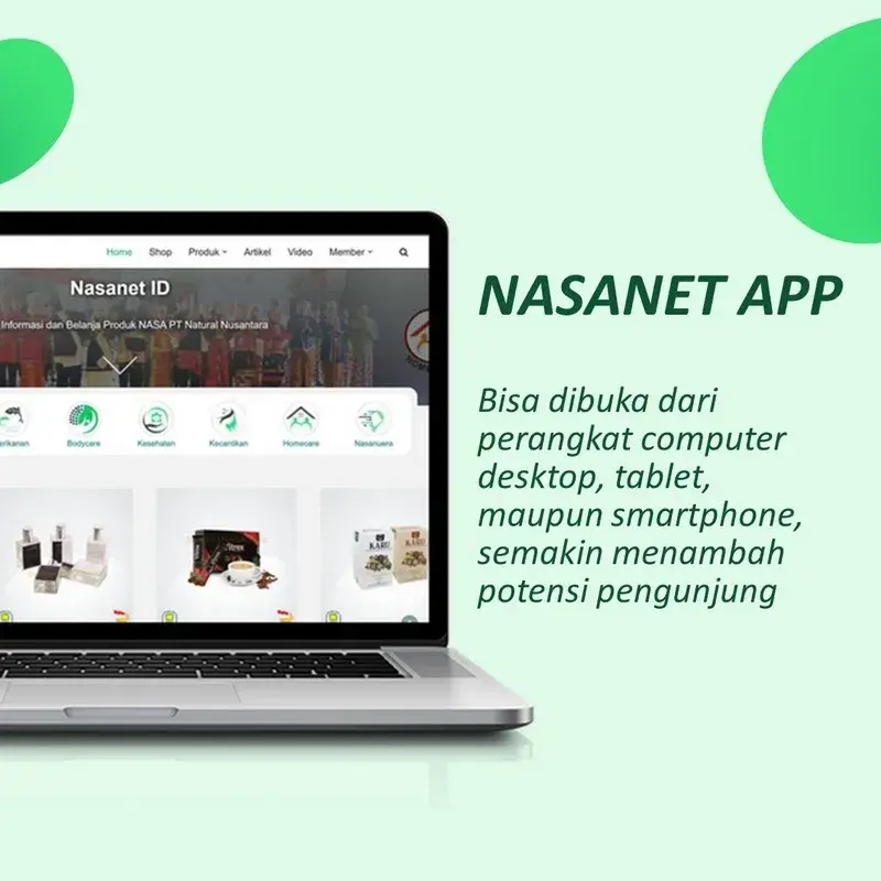 Aplikasi Web Nasanet merupakan alat bantu bisnis Nasa berupa Aplikasi Toko Online Produk Nasa yang didesain untuk memudahkan Mitra Usaha Nasa dalam meningkatkan penghasilan dengan memanfaatkan teknologi.